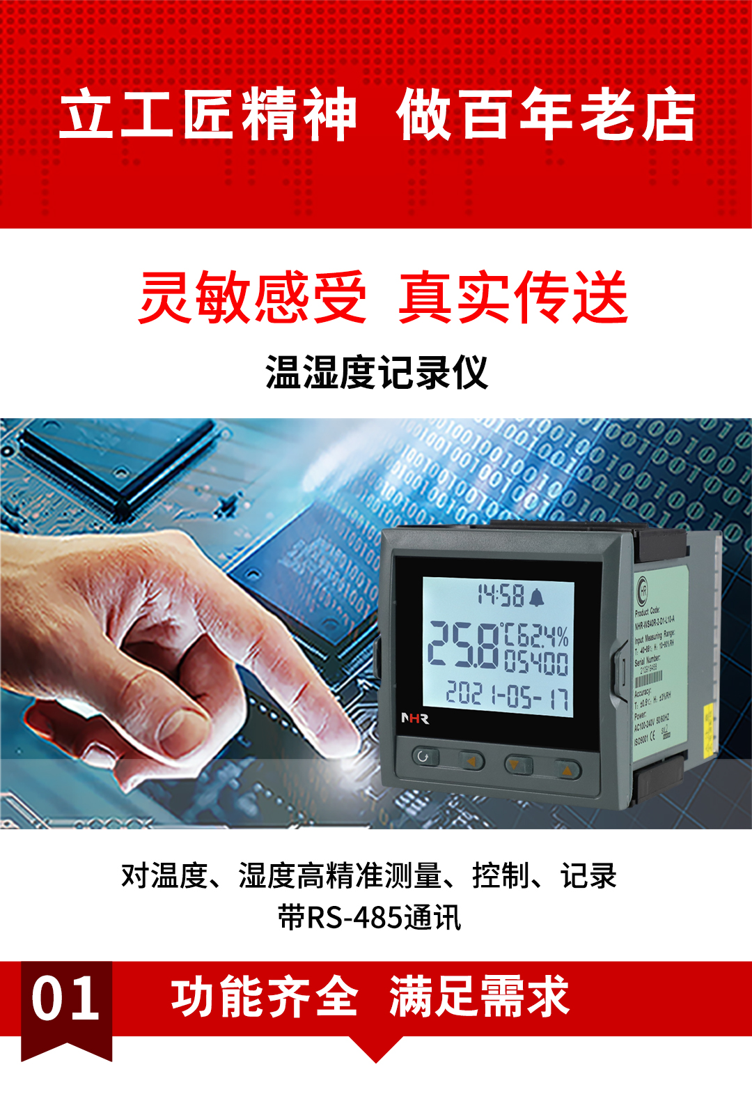 虹潤公司是專業(yè)生產(chǎn)環(huán)境監(jiān)測儀表的國家專精特新“小巨人”企業(yè)。生產(chǎn)的盤裝式溫濕度記錄儀,具有溫度、濕度、露點(diǎn)高精準(zhǔn)的測量,數(shù)據(jù)記錄與轉(zhuǎn)存,配上位機(jī)軟件,繼電器/蜂鳴器雙報(bào)警,帶RS485/RS232通訊輸出等級等特點(diǎn)。產(chǎn)品獲得一種手持式低功耗溫濕度檢測儀、大屏幕溫濕度記錄儀等2項(xiàng)國家發(fā)明專利,主持起草物聯(lián)網(wǎng)智能溫度儀表通用技術(shù)條件、冷鏈溫度記錄儀等2項(xiàng)國家標(biāo)準(zhǔn),通信系統(tǒng)多通道數(shù)據(jù)采集控制終端規(guī)范軍用標(biāo)準(zhǔn),以及現(xiàn)場設(shè)備集成等5項(xiàng)智能制造國家標(biāo)準(zhǔn),參與國際5G標(biāo)準(zhǔn)制定,取得溫濕度儀表等2項(xiàng)相關(guān)軟件著作權(quán)。產(chǎn)品廣泛應(yīng)用于工業(yè)現(xiàn)場、農(nóng)業(yè)大棚、倉儲(chǔ)物流、地下管廊、養(yǎng)殖孵化、配電機(jī)房等諸多領(lǐng)域。