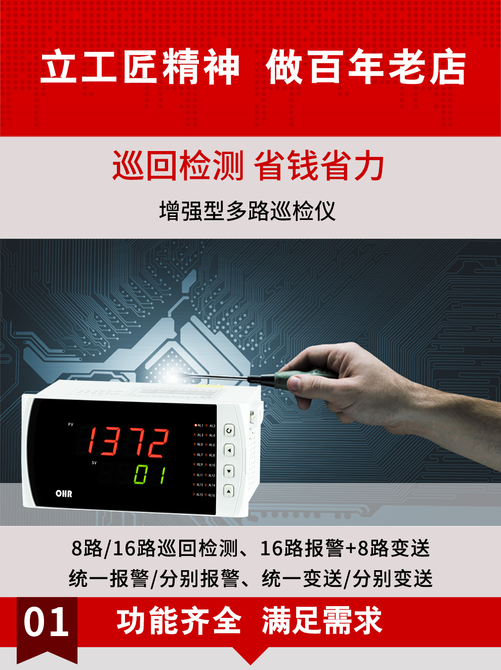 虹潤公司是專業(yè)生產(chǎn)多路溫度巡檢儀的國家專精特新“小巨人”企業(yè),生產(chǎn)的增強型多路巡檢儀,具有8路/16路測量通道,全切換信號輸入,多種輸出類型,高抗干擾,RS485/RS232通訊等特點。產(chǎn)品獲得巡回檢測顯示方法及裝置、儀表殼體等2項國家發(fā)明專利,主持起草工業(yè)過程控制系統(tǒng)用模擬輸入兩位或多位輸出儀表、物聯(lián)網(wǎng)智能溫度儀表通用技術條件等2項國家標準,以及通信系統(tǒng)多通道數(shù)據(jù)采集控制終端規(guī)范軍用標準,參與國際5G標準制定,取得多回路測量顯示控制儀等3項相關軟件著作權。產(chǎn)品廣泛應用于電力、石化、冶金、制藥、水處理、機械配套等各種工業(yè)現(xiàn)場。