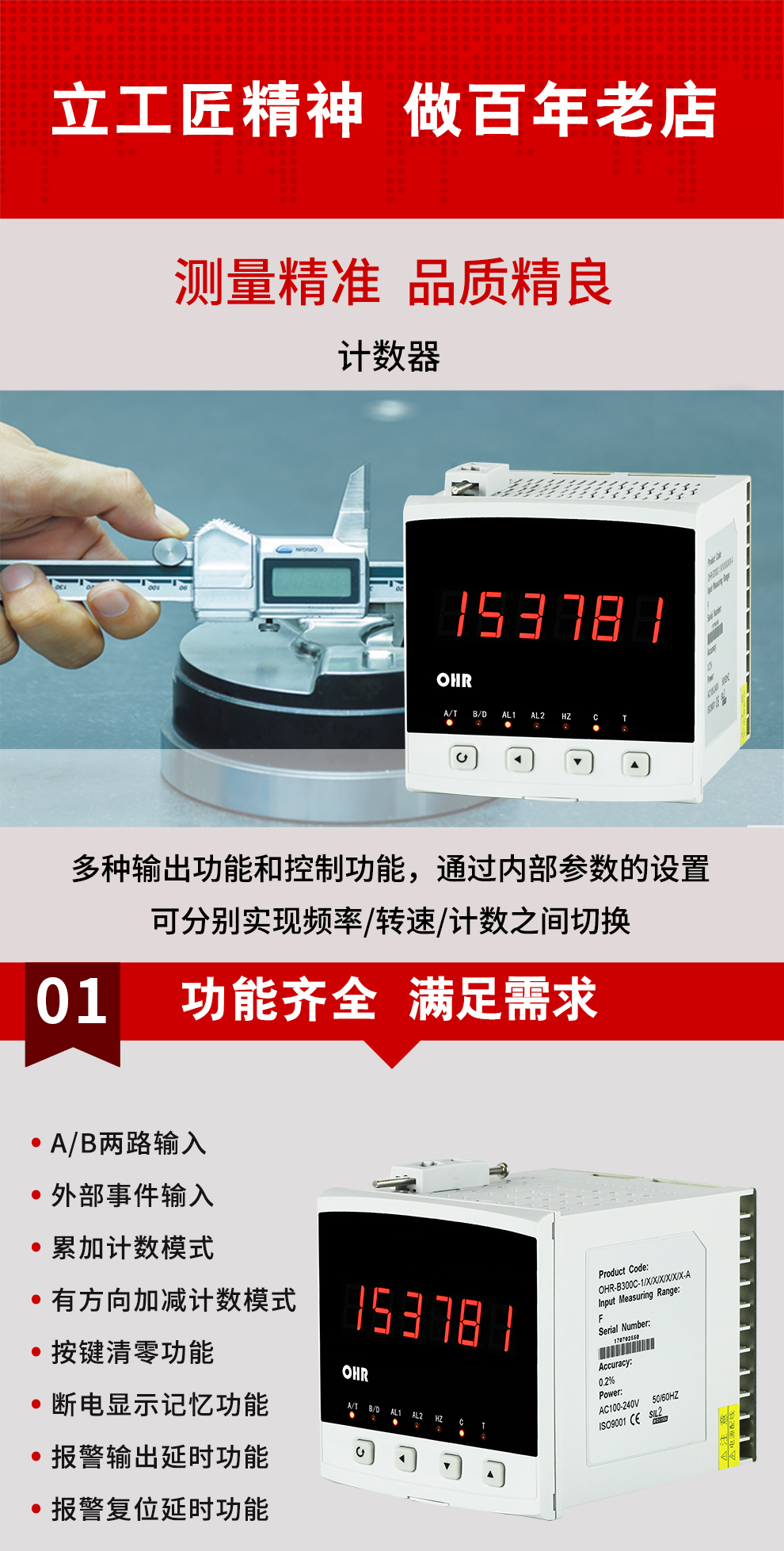 OHR-B300系列計(jì)數(shù)器采用全自動(dòng)貼片封裝工藝,具有很強(qiáng)的抗干擾能力,并具有多種輸出功能和控制功能,多種計(jì)數(shù)模式,廣泛運(yùn)用于電力、石化、冶金、輕工、制藥、航空等諸多領(lǐng)域。