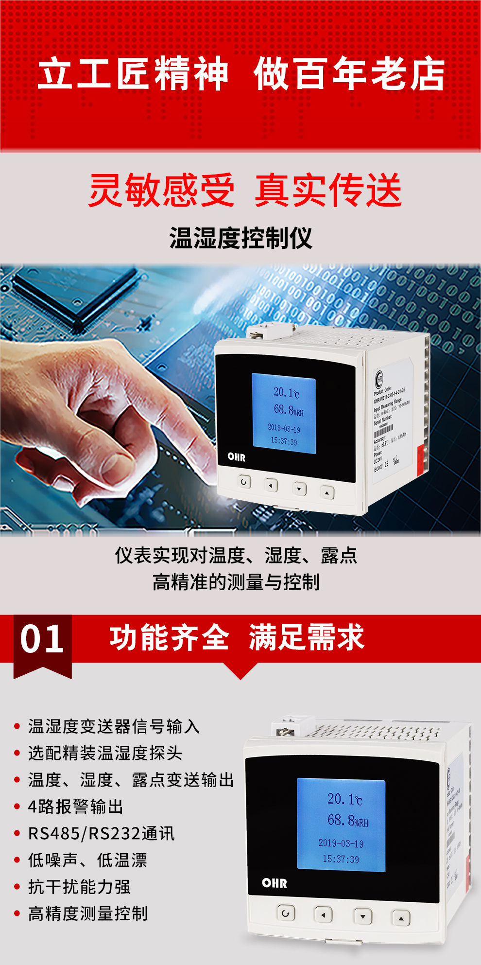 虹潤公司是專業(yè)生產(chǎn)環(huán)境監(jiān)測(cè)儀表的國家專精特新“小巨人”企業(yè)。生產(chǎn)的盤裝式溫濕度控制器,具有溫度、濕度、露點(diǎn)高精準(zhǔn)的測(cè)量,壁掛式結(jié)構(gòu),IP65防護(hù)穩(wěn)定性強(qiáng),高抗干擾,帶RS485/RS232通訊輸出等級(jí)等特點(diǎn)。產(chǎn)品獲得一種手持式低功耗溫濕度檢測(cè)儀、大屏幕溫濕度記錄儀等2項(xiàng)國家發(fā)明專利,主持起草物聯(lián)網(wǎng)智能溫度儀表通用技術(shù)條件、冷鏈溫度記錄儀等2項(xiàng)國家標(biāo)準(zhǔn),通信系統(tǒng)多通道數(shù)據(jù)采集控制終端規(guī)范軍用標(biāo)準(zhǔn),以及現(xiàn)場(chǎng)設(shè)備集成等5項(xiàng)智能制造國家標(biāo)準(zhǔn),參與國際5G標(biāo)準(zhǔn)制定,取得溫濕度儀表等2項(xiàng)相關(guān)軟件著作權(quán)。產(chǎn)品廣泛應(yīng)用于工業(yè)現(xiàn)場(chǎng)、農(nóng)業(yè)大棚、倉儲(chǔ)物流、地下管廊、養(yǎng)殖孵化、配電機(jī)房等諸多領(lǐng)域。